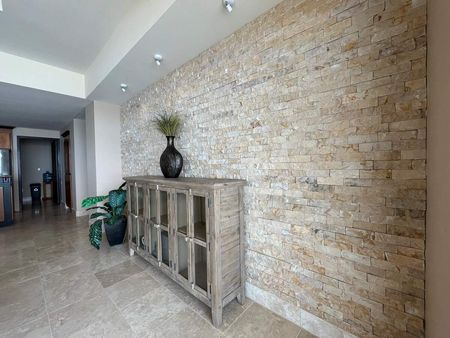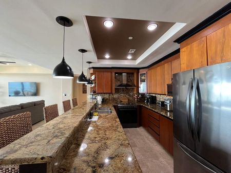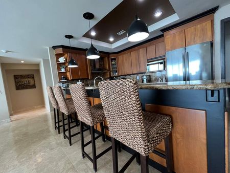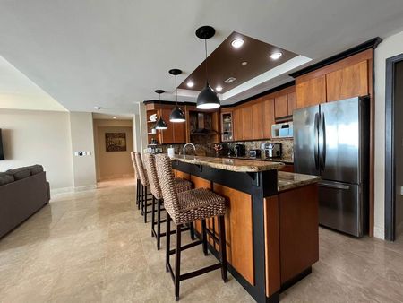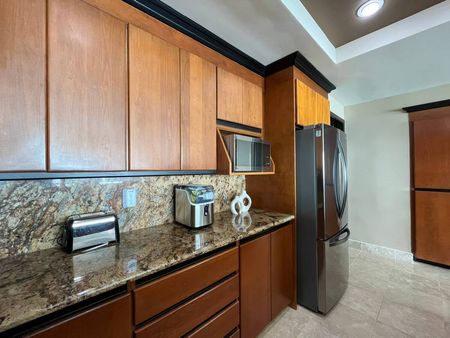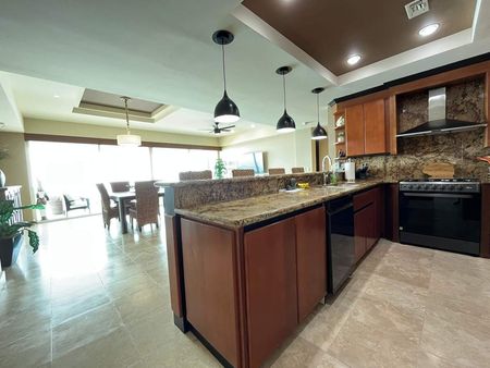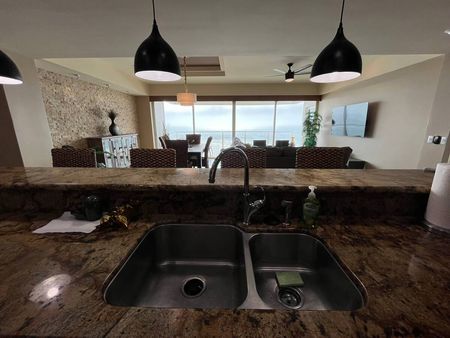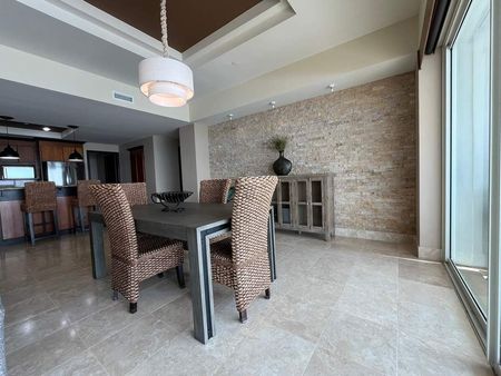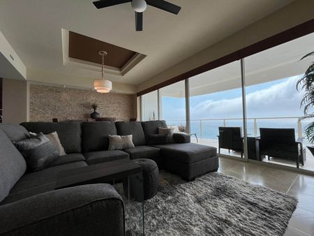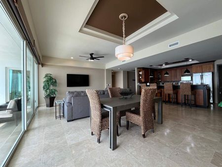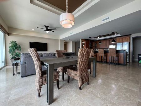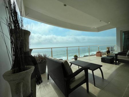 At Palacio del Mar in Rosarito, this furnished 2-bedroom condo for rent offers spectacular ocean views from the 6th floor, featuring an open layout that integrates the kitchen, living, and dining areas with large windows that fill the spaces with natural light and coastal scenery; the split-bedroom design provides privacy, with the master suite offering direct access to an ocean-view balcony; the modern kitchen comes equipped with granite countertops and stainless steel appliances, complemented by elegant finishes throughout; two tandem underground parking spaces are included, all within an exclusive oceanfront community that boasts resort-style amenities such as an infinity pool, semi-Olympic indoor pool, gym, spa with sauna and steam room, sports courts, movie theater, business center, beach access, 24-hour security, concierge services, and more, located just 35 minutes from the San Diego border.